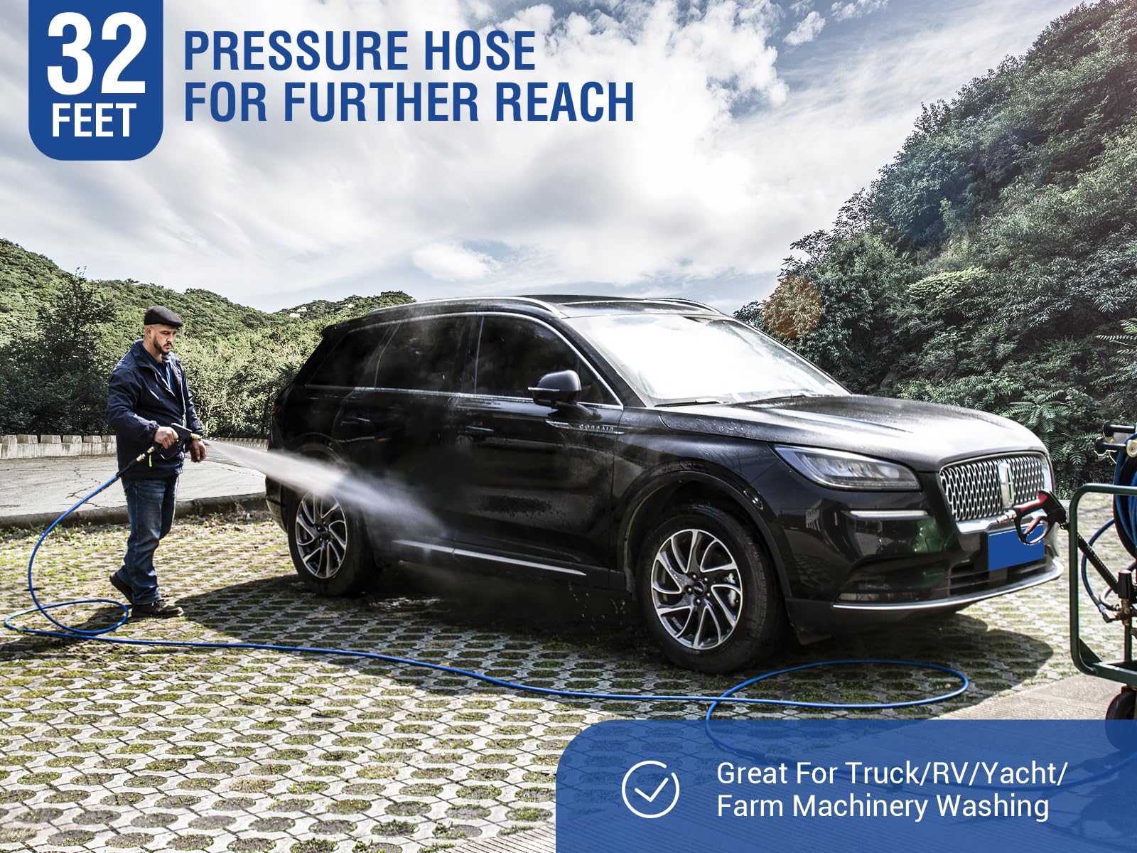 - 【Extended 32FT Reach】: Compared to standard 25FT hoses, this upgraded 32FT power washer hose provides extra length and mobility. Perfect for washing large vehicles, SUVs, trucks, boats, patios, and garden areas without constantly moving your pressure washer. Reach every corner with ease.
