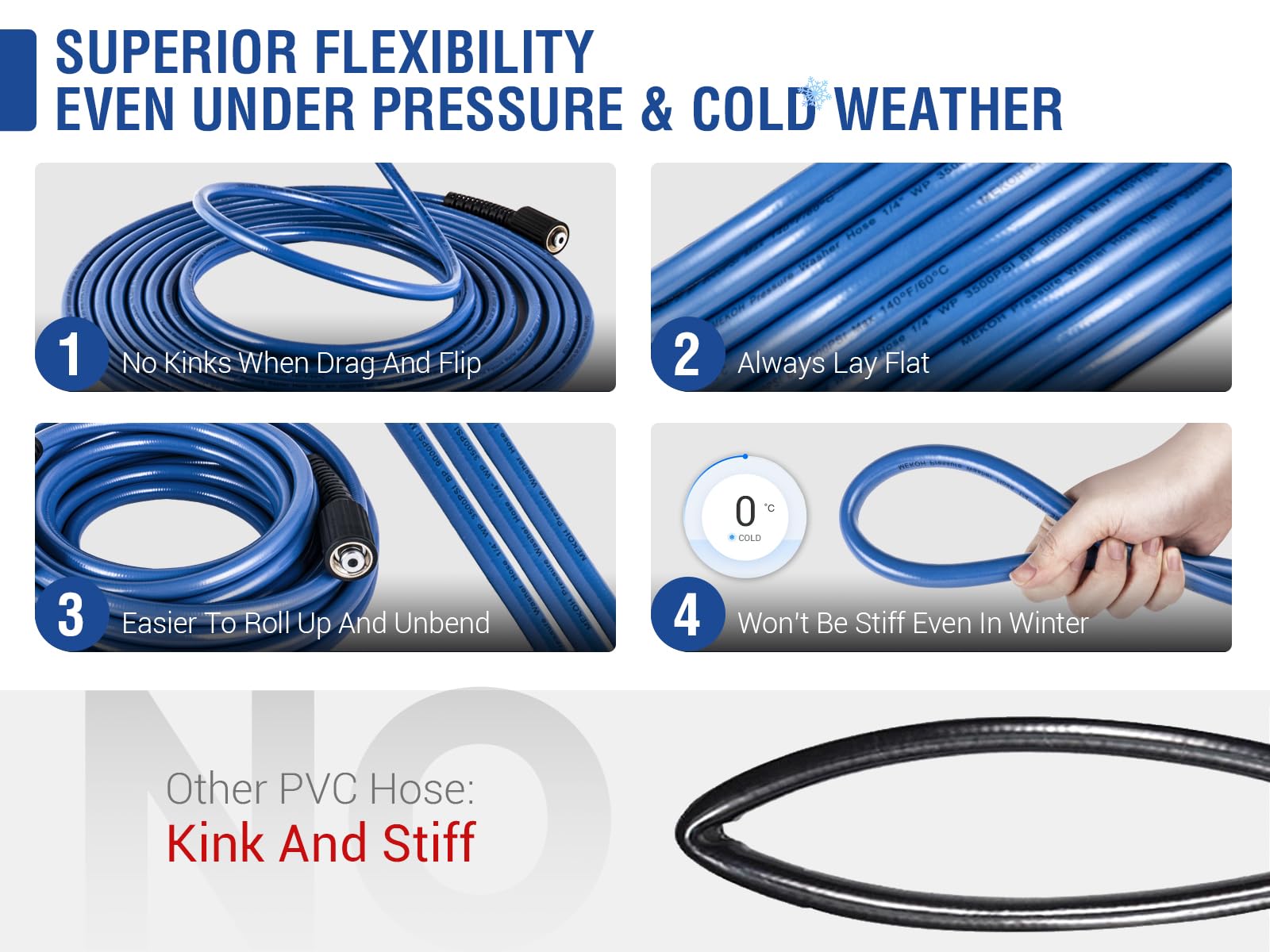 - 【Kink-Free & Flexible Design】: No more twisting or tangling — this kink resistant pressure washer hose stays flat during use and rolls up smoothly after cleaning. Designed for all-weather flexibility, it maintains softness in cold temperatures and resists stiffness under high heat, ensuring reliable performance year-round.