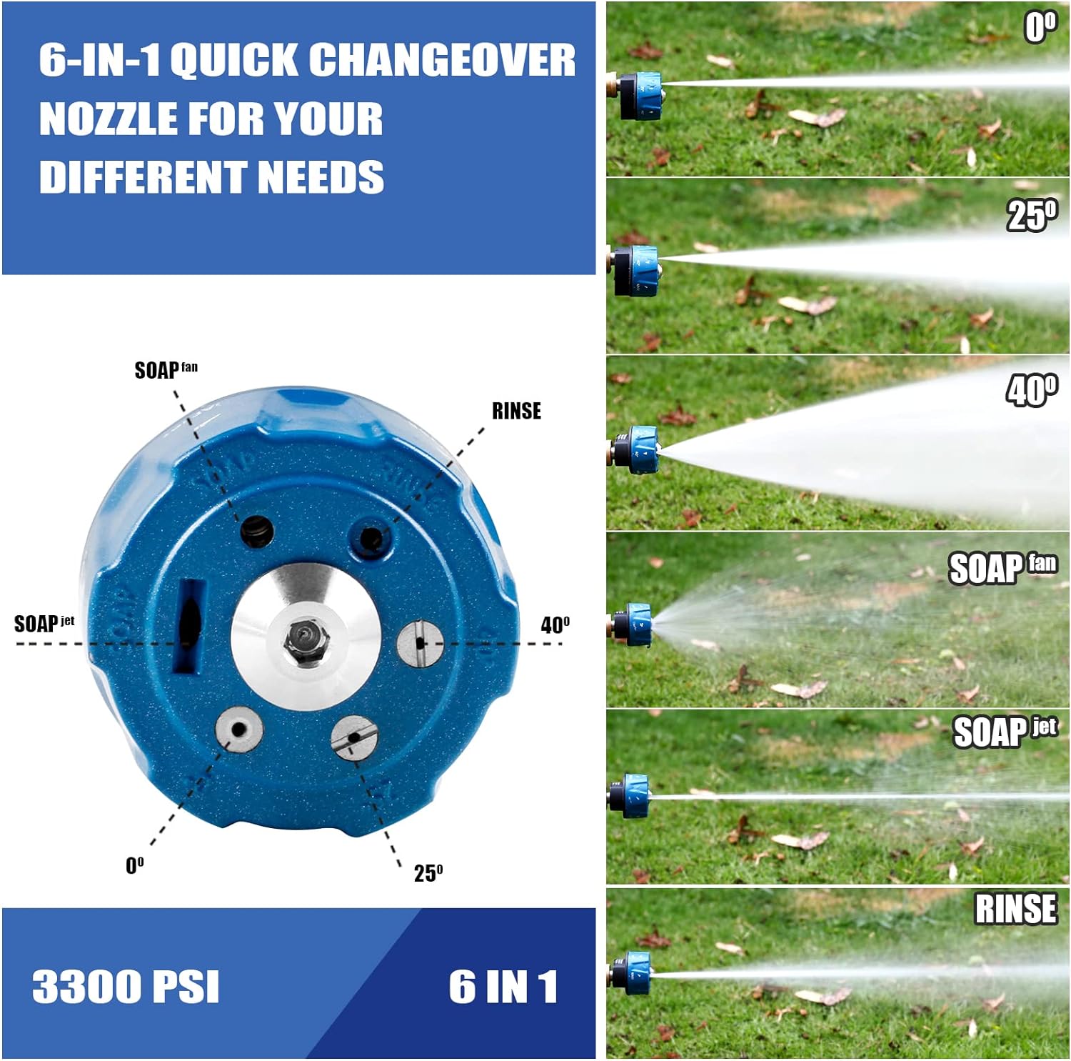 - Versatile Cleaning: The MEKOH 6-in-1 pressure washer nozzle offers six quick changeover spray patterns: 0, 25, 40 Degree, Rinse, Soap Fan, and Soap Jet, suitable for various cleaning tasks.